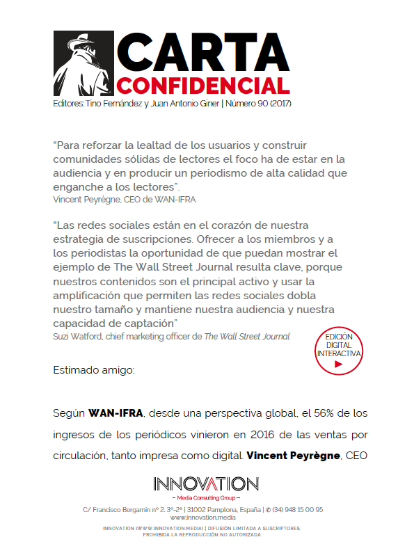 Subscribe to the Confidential Newsletter: Innovations in Newspapers: New trends and Successful Cases and receive a PDF of the last edition of World Reports free of charge.